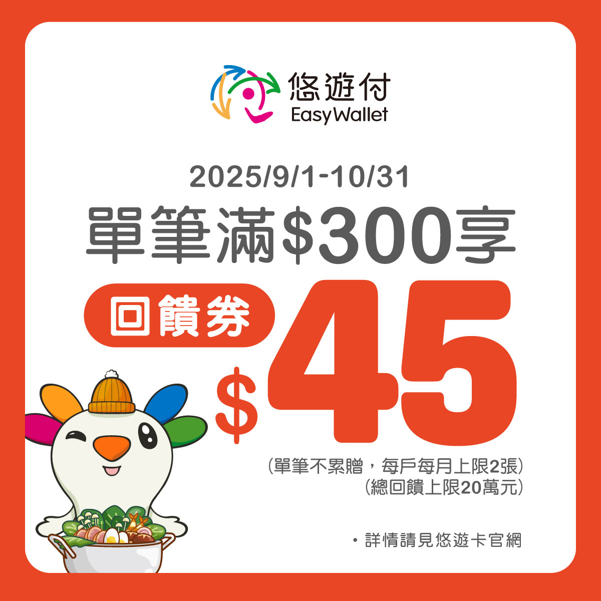 2025/9/1–10/31 悠遊付限定優惠 2025/09/01~2025/10/31 2025/9/1–10/31 來12mini消費,用悠遊付結帳 單筆消費滿 300 元就送 45 元現金回饋券1張