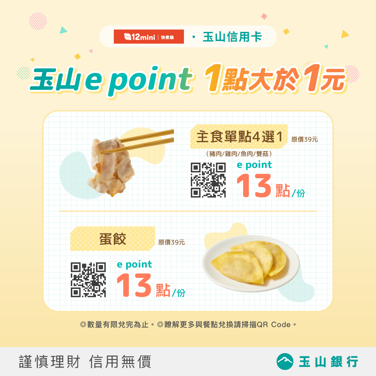 玉山e point 1點大於1元,兌換「主食單點4選1」、 「蛋餃」限時優惠! More